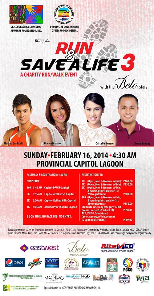 Run and Save Life 3 “A charity run / walk event” happening on February 16, 2014 at the Provincial Capitol Lagoon, Bacolod City and get to RUN/WALK with the BELO Stars