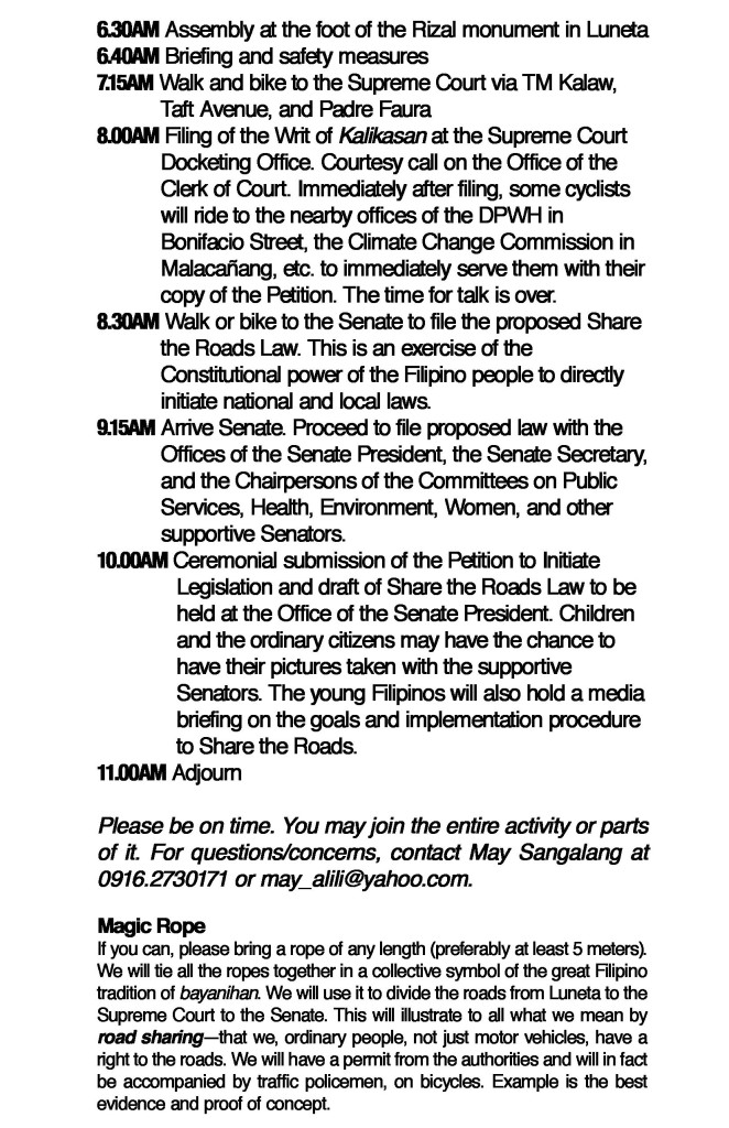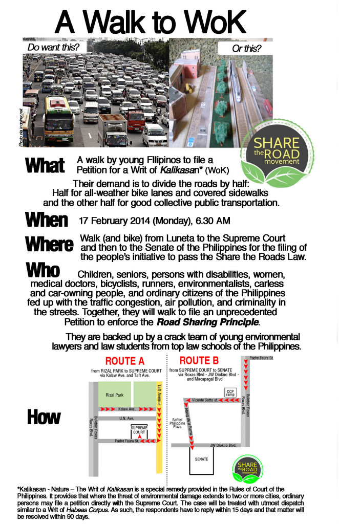 Headed by environmental crusader Antonio Oposa, the Work to WOK is a walk by young Filipinos to file a petition for a ‘Writ of Kalikasan’ (WOK) that would require the government to implement, plan and devise a road-sharing scheme for motorist, cyclists and pedestrians.