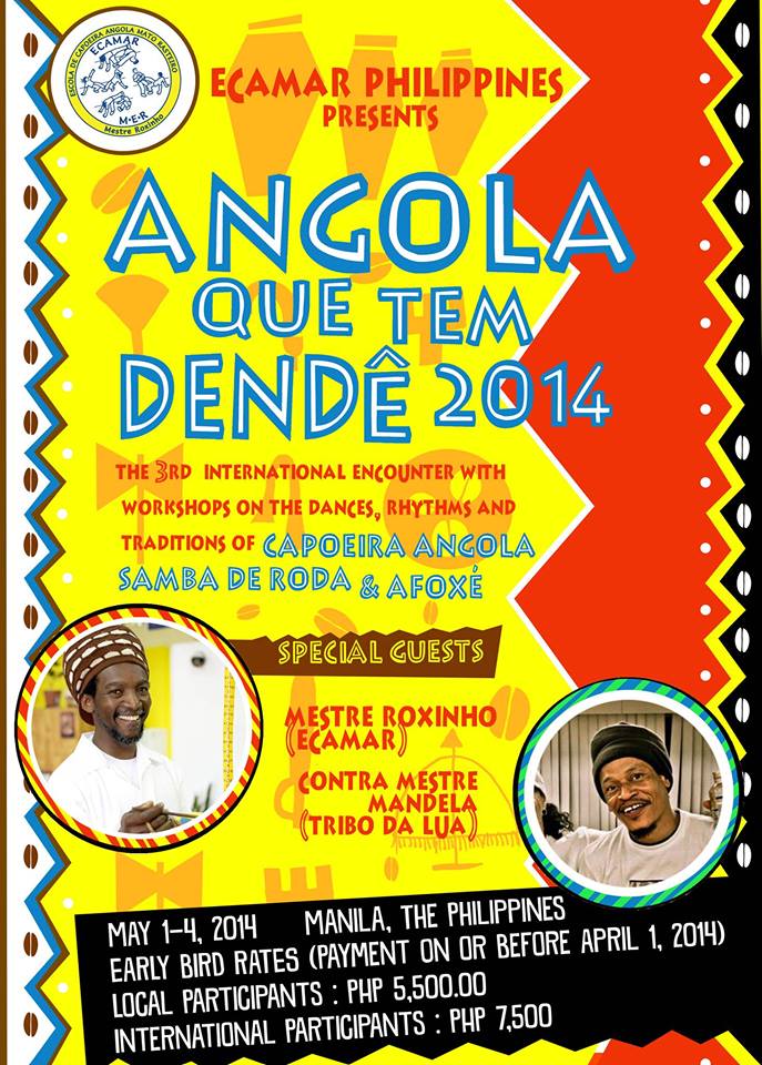 From the 1st to the 4th of May this year, ECAMAR Philippines will be hosting “Angola Que Tem Dende 2014”, our 2nd International Capoeira Angola encounter. This year we will be bringing our School’s founder, Mestre (Master) Roxinho who currently teaches in Sydney, Australia and Contra Mestre Mandela from Tribo da Lua in Tokyo, Japan to give workshops on Capoeira Angola, Samba de Roda, and Afoxé which are other manifestations of Afro-Brazilian Culture expressed through dance, music and ritual. As the Encounter will primarily be a cultural one, we would have the event in the historic “Old City” of Manila; we also feel that this would be a great way to promote the significance of the City of Manila to the foreign participants.