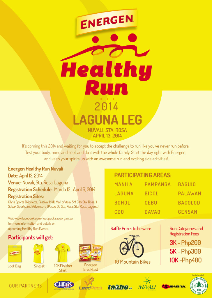 It’s coming this 2014 and waiting for you to accept the challenge to run like you’ve never run before. Test your body, mind and soul and do it with the whole family. Start the day right with Energen and keep your spirits up with an awesome run and exciting side activities!