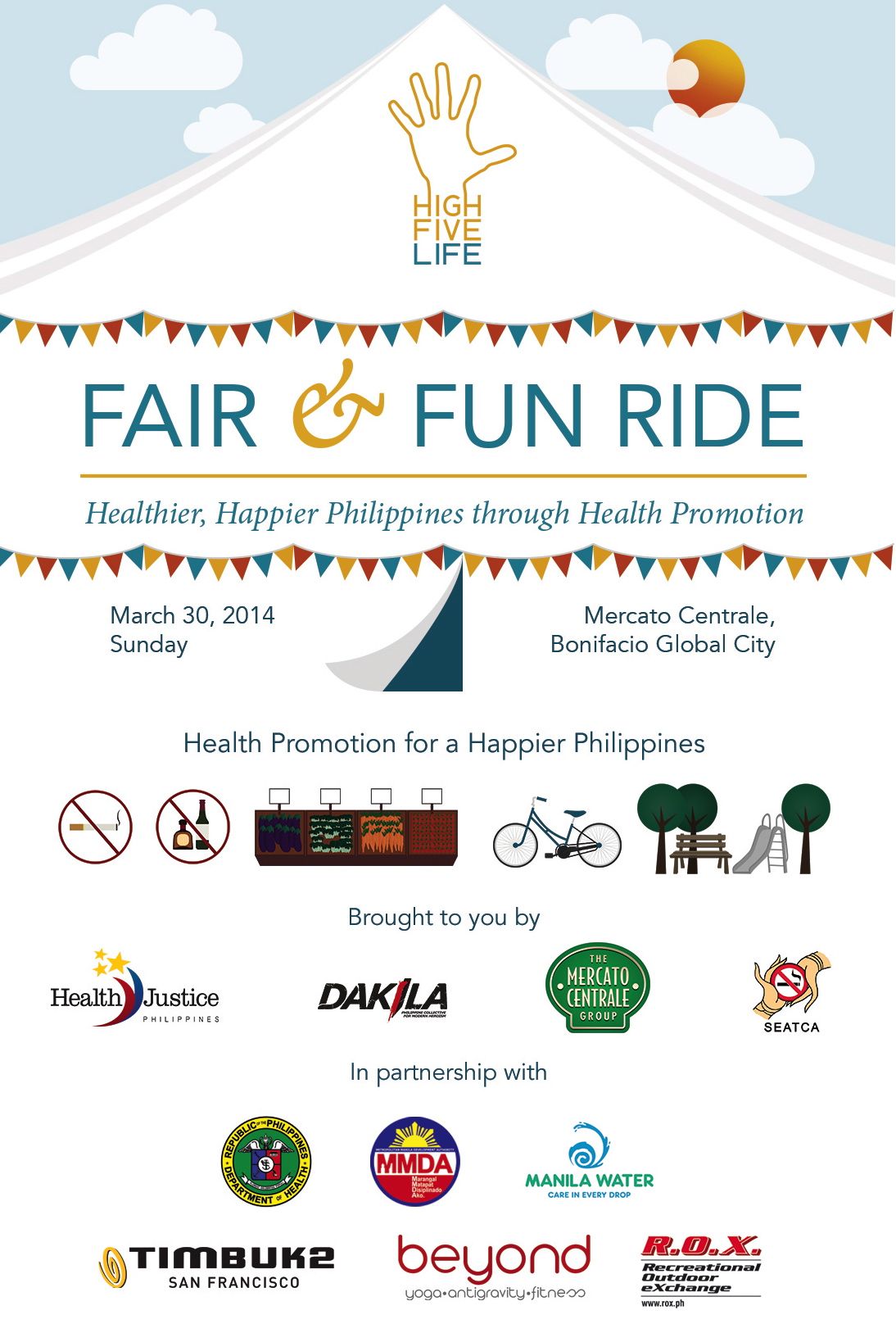 High5Life will have a Fair + Fun Ride event on March 30 at Mercato Centrale in Bonifacio Global City, Taguig in partnership with Dakila-Philippine Collective for Modern Heroism and Southeast Asia Tobacco Control Alliance (SEATCA). The event will feature the 5 different themes of Health Promotion – healthy diet, physical activity, tobacco control, alcohol control, and road safety – through a bike ride around BGC, a healthy food and artisan fair, booths and demos for healthy living practices, and other fun activities!