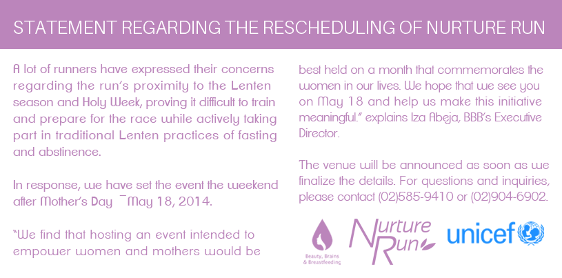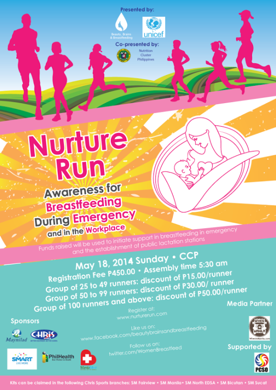 Nurture Run is happening this May 18, 2014 at the Memorial Circle, Quezon City. A run that aims to support breastfeeding in disaster-stricken areas and in establishing public lactation stations in the workplace