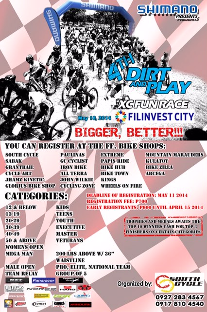 On May 18, 2014, 4th Shimano Dirt and Play Fun Race is happening at Filicity Trails, Filinvest Alabang. Check out details below.
