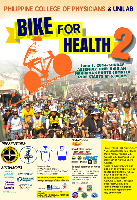 The Philippine College of Physicians together with UNILAB is once again bringing us Bike for Health 2, an advocacy ride promoting a healthy lifestyle, happening on June 1, 2014 at the Marikina Sports Complex.