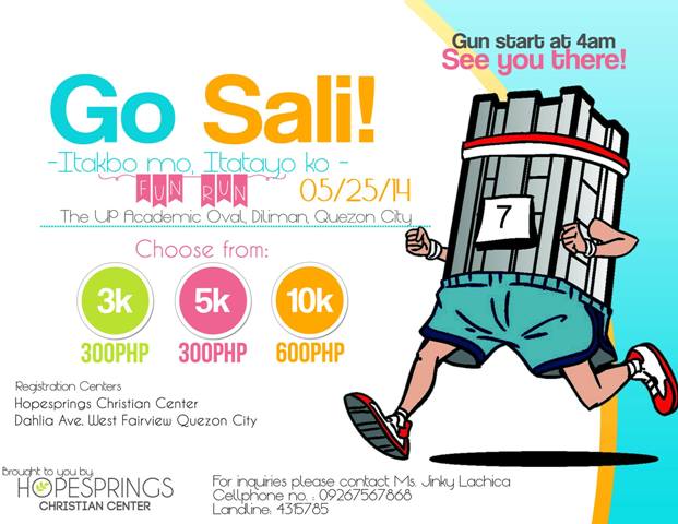 On May 25, 2014, Go Sali! Itakbo Mo Itatayo Ko 2014 is happening at UP Academic Oval, Diliman Quezon City. Proceeds of this event will go to church building. Check out the details