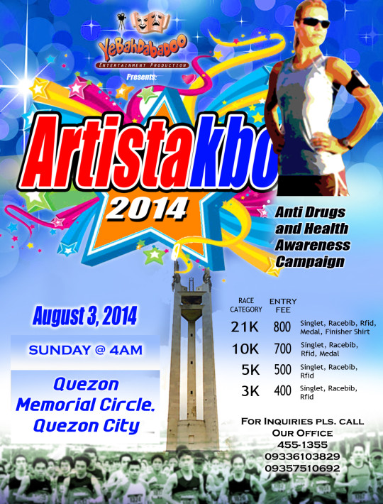 Yebahdabadoo Entertainment Production and Bulacan Rehabilitation Foundation Inc. will be hosting a Fun Run Activity called “ARTISTAKBO 2014” An “Anti-Drugs and Health Awareness Campaign”. This event will be participated by country’s famous stars.