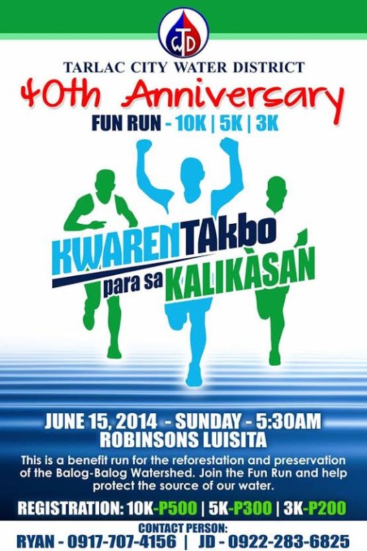 The Tarlac City Water District will be having a fun run that will be held on June 15, 2014 at Robinson’s Luisita Activity Area, San Miguel Tarlac City dubbed as “ KWARENTAKBO PARA SA KALIKASAN”, the proceeds of which will be intended for the preservation of the Balog-Balog Watershed situated at Brgy. Maamot, San Jose Tarlac. The Balog-Balog Watershed is a critical watershed, if not protected and preserved may affect the sustenance of water supply in the future.