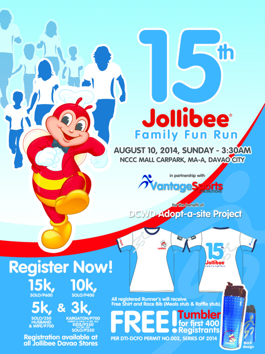 JOLLIBEE DAVAO is once again staging its 15th Jollibee Family Fun Run set on August 10, 2014, Sunday, 3:30 am at the NCCC Mall of Davao, Parking area. This annual run exhibits our continued campaign to promote wellness to families and running enthusiasts of Davao City.