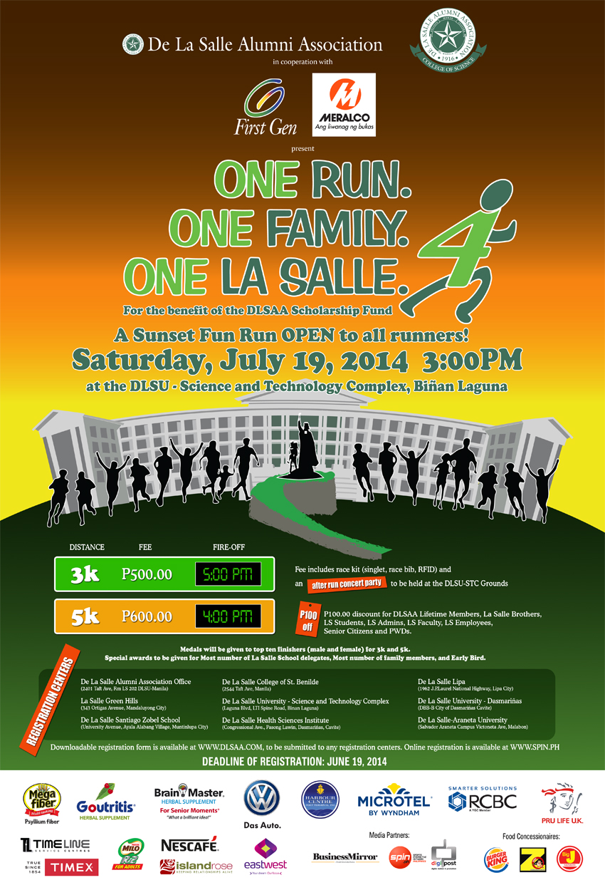 A sunset run for the benefit of the DLSAA Scholarship Fund happening on July 19, 2014 @ 3PM at the DLSU – Science and Technology Complex, Binan Laguna. Details here