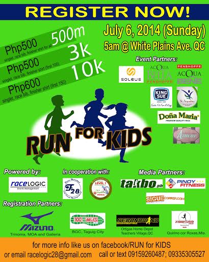Looking for some activities for your kids? This July 6, 2014 Run for Kids is happening at White Plains Avenue, Quezon City.