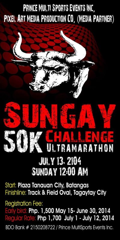 Organized by Prince Multi Sports Events,Inc. the group that staged the highly successful Cavinti Adventure Road & Trail Marathon and the Luneta to Tagaytay – LU2TA 60KM Midnight Ultramarathon, Taal Volcano 360 Challenge. The SUNGAY Challenge Ultramarathon will have just one category distance of 50km which will pass through Tanauan Road,Talisay-Banga Road, Sungay Talisay-Tagaytay-Ligaya Drive & Tagaytay City Finishline.