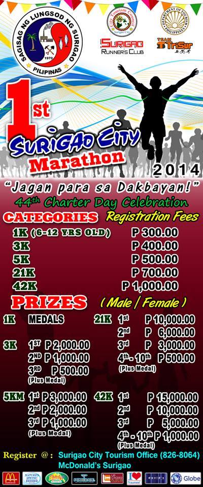 The first ever marathon organized by the Surigao Runners Club in partnership with the Surigao City Government in celebration of its 44th Charter Day. It is filled with big prizes and will be well-attended by stars like Marco Alcaraz, Luis Alandi, Joem Bascon, Archie Alemana and Dimples Romana!!! Wanna run in Surigao City?