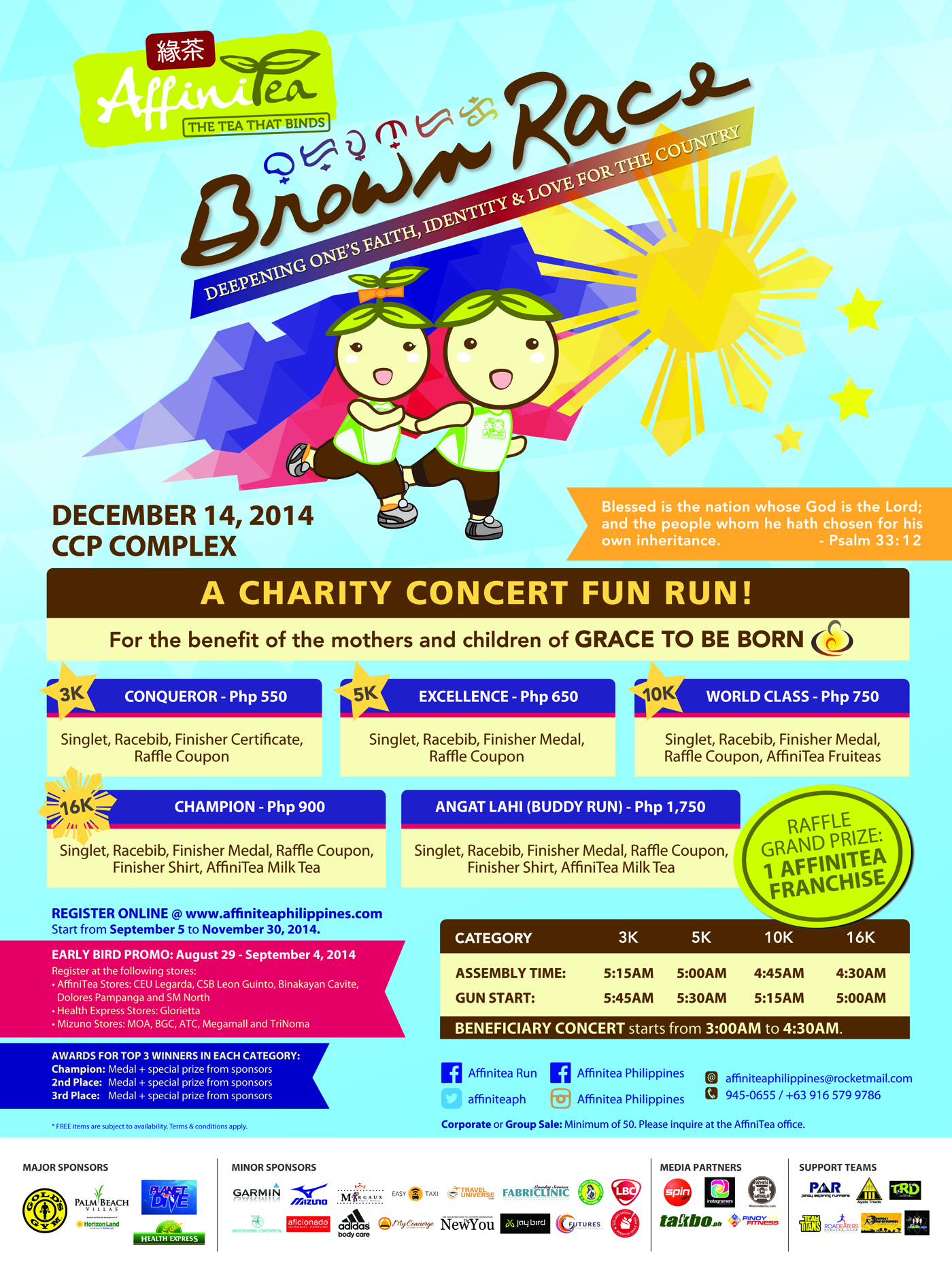 AffiniTea Philippines presents a charity concert fun run dubbed the Brown Race which aims to deepen once FAITH, IDENTITY & LOVE FOR THE COUNTRY by standing firm to the truth of righteousness, love of neighbors and key characteristics that molds and identify the uniqueness of Filipinos among other races. To empower Filipino people to achieve GREAT THINGS in life and to succeed in their own gifts.