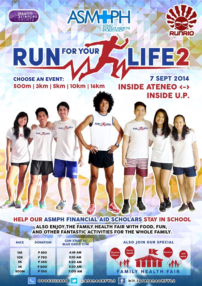 Run For Your Life 2 is a benefit run for the scholars of the Ateneo School of Medicine and Public Health, in cooperation with Runrio and the Health Sciences Society of the Ateneo de Manila University.