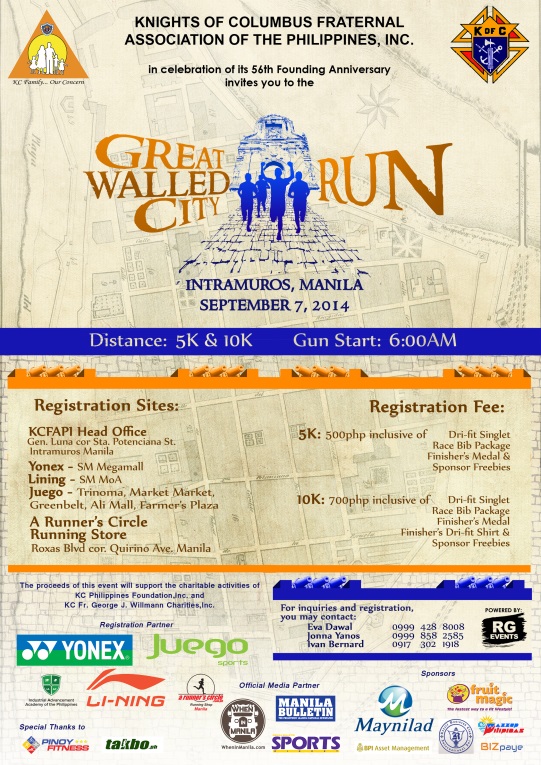 The Knights of Columbus Fraternal Association of the Philippines, Inc. (KCFAPI) in partnership with RG Events Co., a mutual benefits association providing insurance coverage to its members and their family, is celebrating its 56th Year of existence! Inspired by the virtues of charity and care for the most needy by its founder, Fr. George J. Willmann, SJ, the proceeds of this fun run will be for the benefit of the two (2) foundations that provide scholarships to poor but deserving students, religious scholarships for priestly vocations. The two (2) foundations likewise provide assistance to calamity-stricken areas like the victims of typhoon Yolanda. The week-long celebration will kick-off on September 7, 2014(Sunday) with a 5 & 10-Kilometer Fun Run around the historic Intramuros dubbed as “THE GREAT WALLED CITY RUN”.