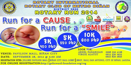 Rotary Club of Metro Biñan, in partnership with Go ForWARD Biñan Foundation Inc. and the City Government of Biñan will be holding its first Fun Run for the benefit of cleft palate and for the surgical operation of indigent hernia, myoma and goiter patients in the City of Biñan.