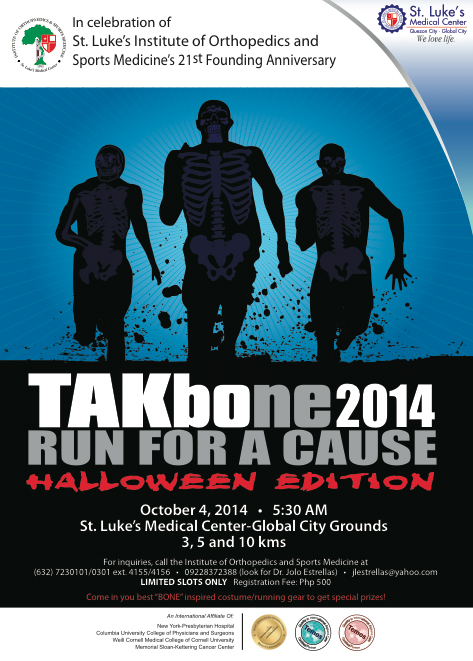 In celebration of their 21st Founding Anniversary, the Institute of Orthopedics and Sports Medicine will be conducting a fun run entitled “TAKBONE 2014”, on October 4, 2014 at St. Luke’s Medical Center – Global City Grounds.