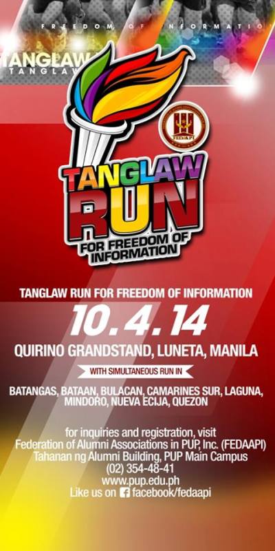The Tanglaw Run for FOI is an advocacy run for the passage of the Freedom of Information Act. The event is being organized principally by the Federation of Alumni Associations in PUP, Inc. (FEDAAPI), with participation from the Right to Know. Right Now! Coalition. The name “Tanglaw” symbolizes the PUP community contributing to giving light to pressing social concerns. There will be a short program before the run at 4:30 am. Gun start is at 5:00 am. Program/assembly of runners will be at the Quirino Grandstand.