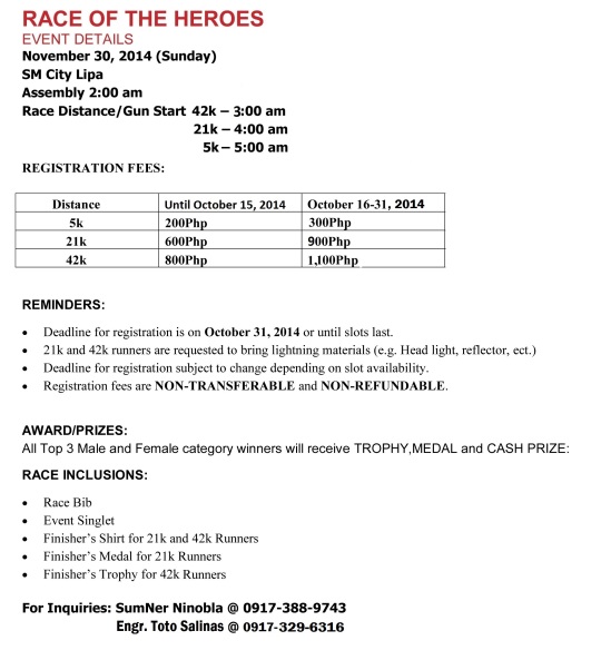 Race of the Heroes, organized by the Lipa Runners, is happening on November 30, 2014 at SM City Lipa.