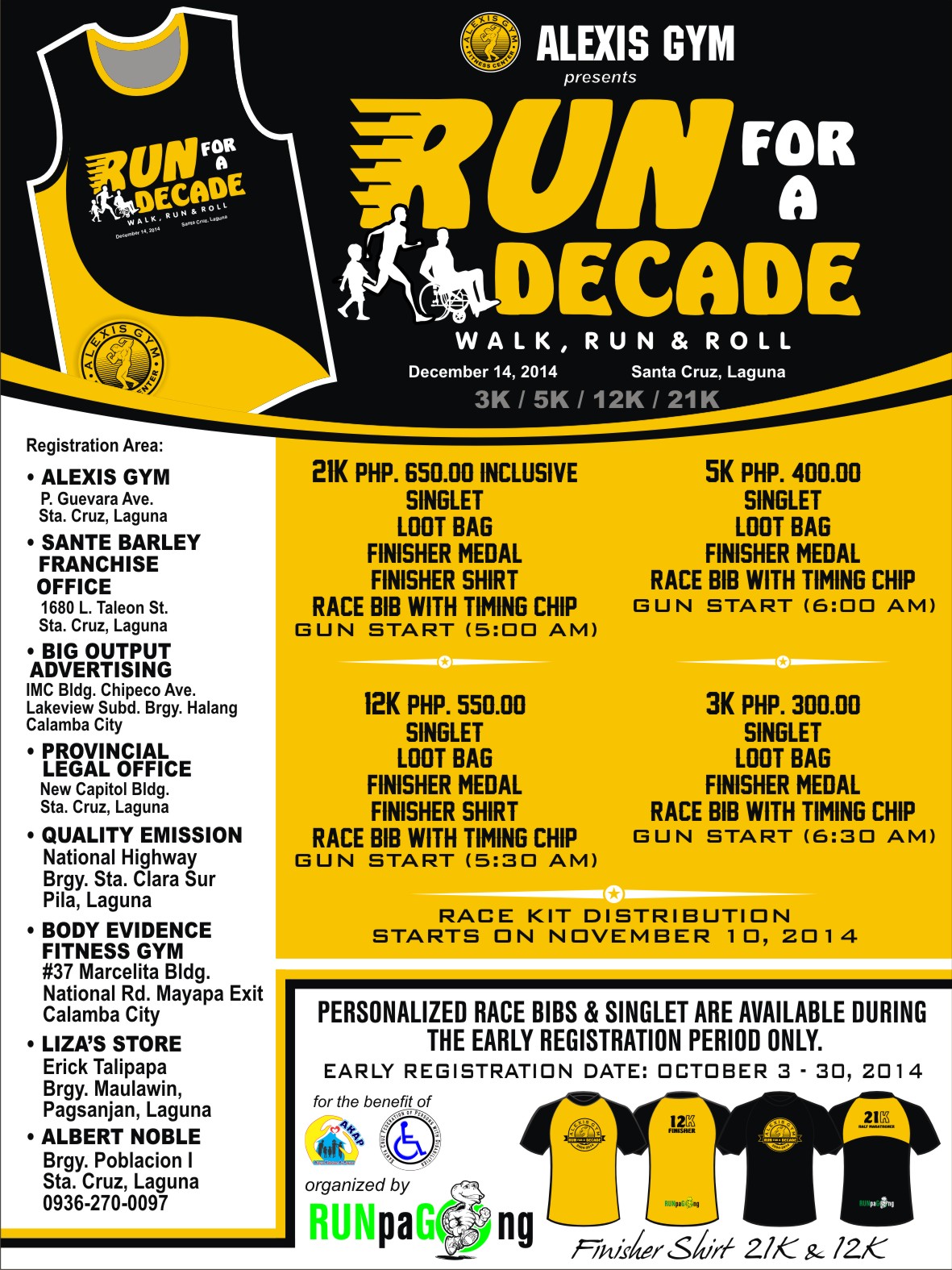 In celebration of Alexis Gym’s 10th anniversary, they will be conducting a FUN RUN with the theme “RUN, WALK and ROLL: RUN For A DECADE”. This event is in coordination with the Municipal Social Welfare and Development Office of Santa Cruz, Laguna with the assistance of other organizations. Proceeds from this project will benefit the People With Disabilities (PWDs) and Children in Conflict with the Law (CICL) in the municipality of Sta. Cruz.