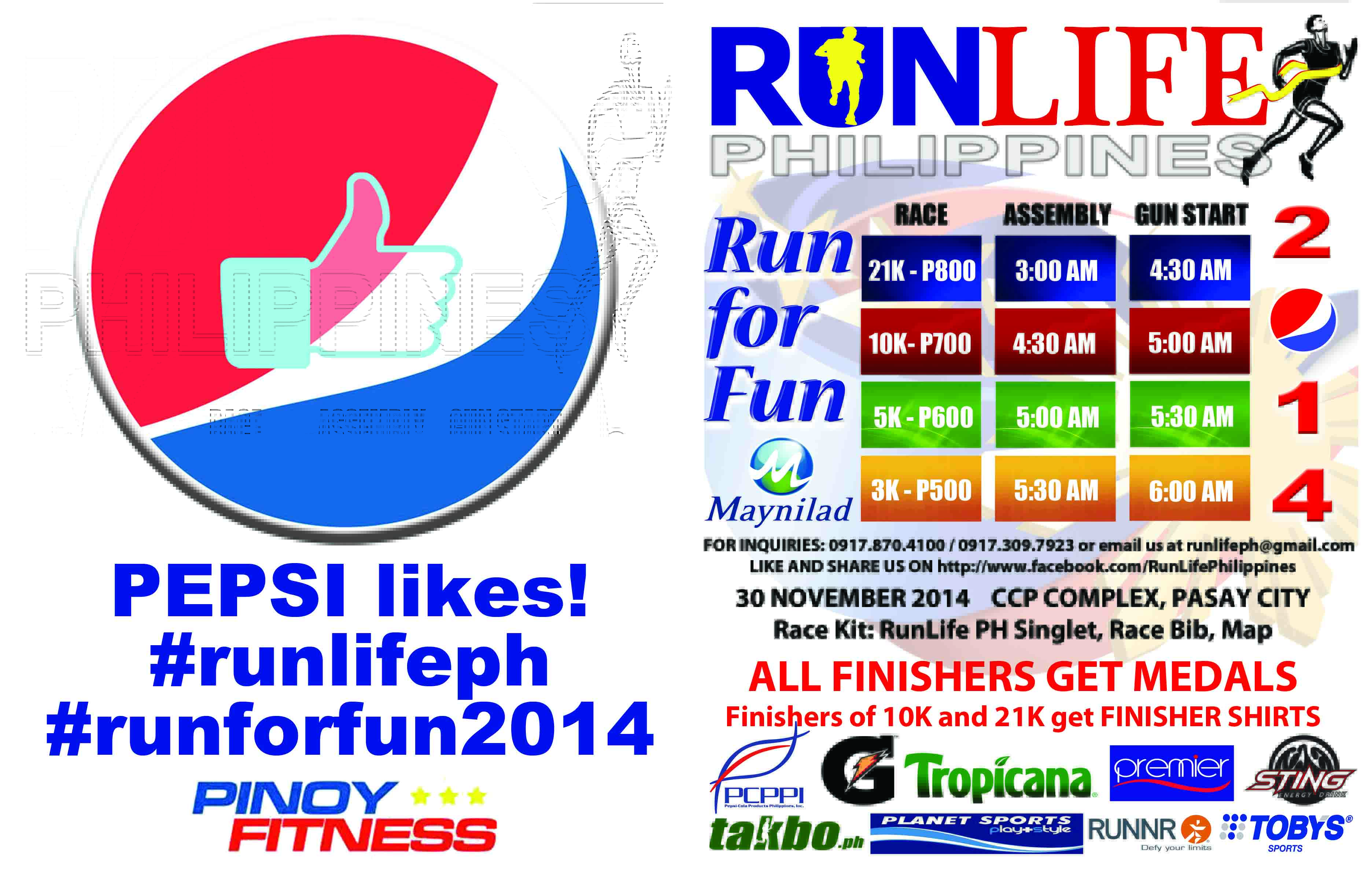 RunLife Philippines in partnership with Pepsi-Cola Products Philippines, Inc. (maker of Gatorade, Sting, Premier and Tropicana) with Maynilad enjoins you to have healthful fun with us.