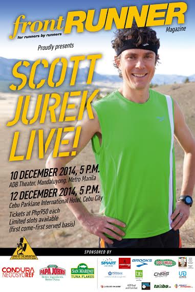 Frontrunner Magazine invites runners to take part in a once-in-a-lifetime opportunity to meet and listen to the running legend Scott Jurek. This will be held on December 10, 2014 at the Asian Development Bank (ADB) Theater, Ortigas at 5:00PM and on December 12, 2014 at Cebu Parklane International Hotel, also at 5:00PM.
