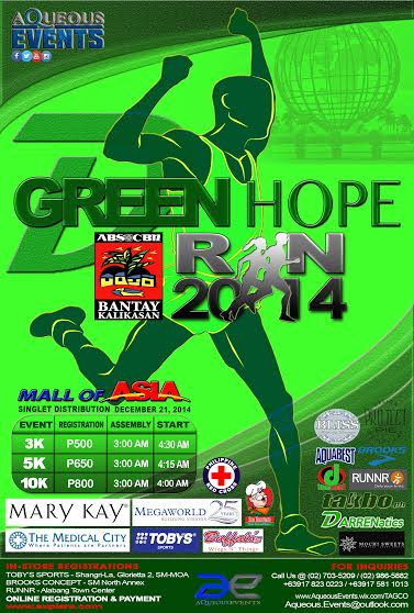 D’ Green Hope Run 2014 is a “Run-for-a-Cause” organized by Aqueous Events in partnership with ABS-CBN Lingkod Kapamilya Foundation: Bantay Kalikasan. Significant portion of the proceeds will be donated to the Foundation in promoting Eco-tourism projects through their Green Initiatives.