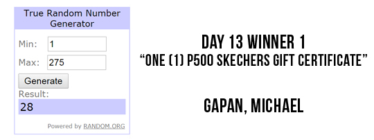 Day 13 of our 20 days till Christmas Giveaway! We’re giving away (2) P500 Skechers Gift Certificates.