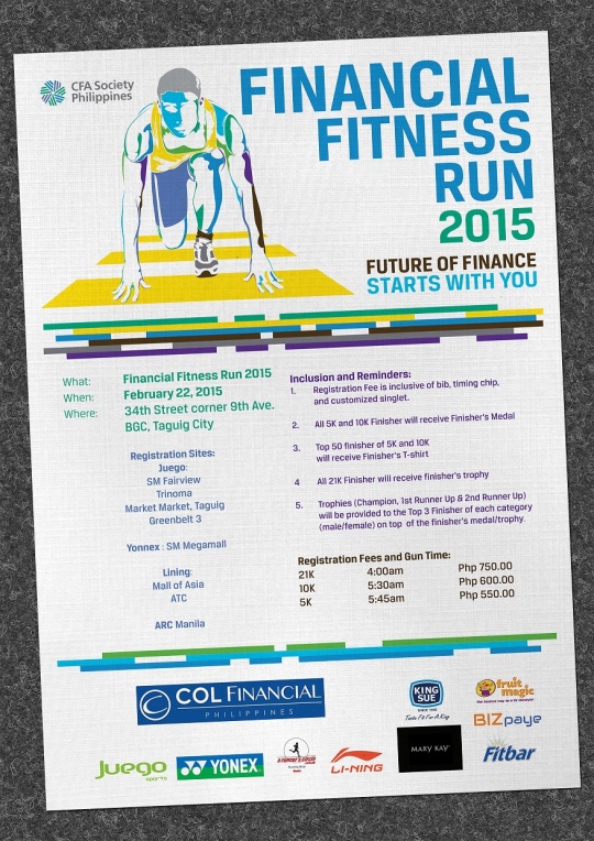 The Financial Fitness Run is the annual fun run of CFA Society Philippines that aims to capitalize on the popularity of the running sport in educating the investing public about the importance of being financially fit and how to be financially fit.
