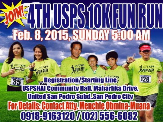 The much-awaited fun run event in San Pedro City, Laguna is back! Now on its 4th year, the USPS HOMEOWNERS ASSOCIATION INC. will again hold the USPS 10k FUN RUN on February 8, 2015, Sunday, 5am at Maharlika Drive, United San Pedro Subdivision, San Pedro City.