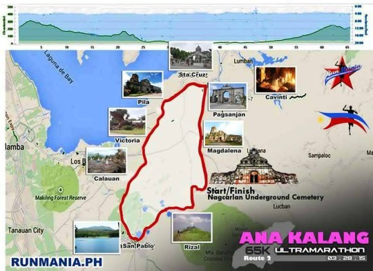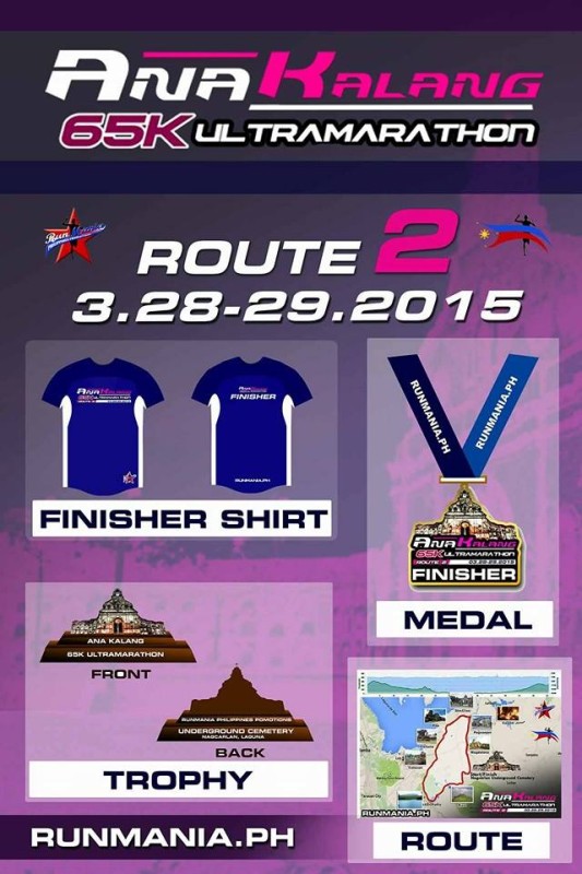 The Caliraya Runners, in cooperation with Run Mania Philippines Promotion, will be conducting ANA KALANG 65K UltraMarathon on March 28, 2015 in Nagcarlan, Laguna.