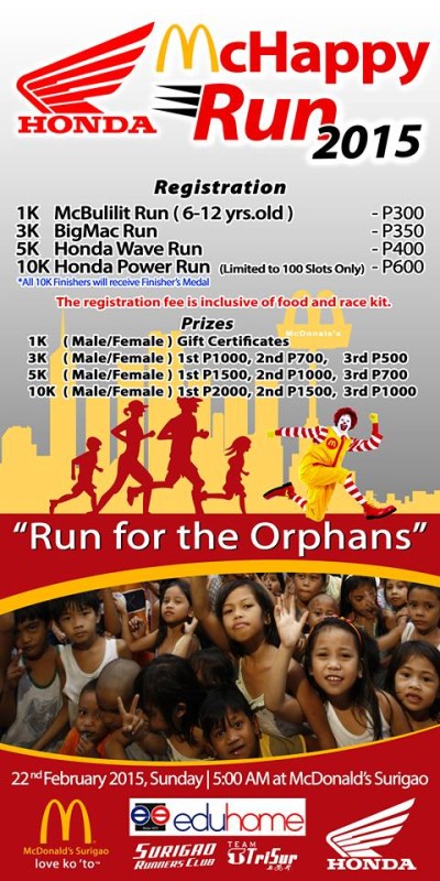 Honda McHappy Run, organized by the Surigao Runner Club, is happening on February 22, 2015 at McDonald’s Surigao City.
