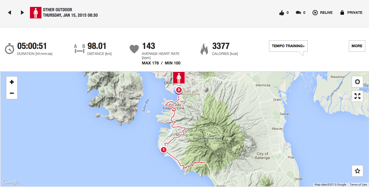 It details your time, distance, calories burned, a map of your route, pace, altitude and heart rate. It even gives you the option to relive your workout and analyze in detail how you performed during your training or race! Here’s a sample the RELIVE feature during one of my training run for Condura Marathon