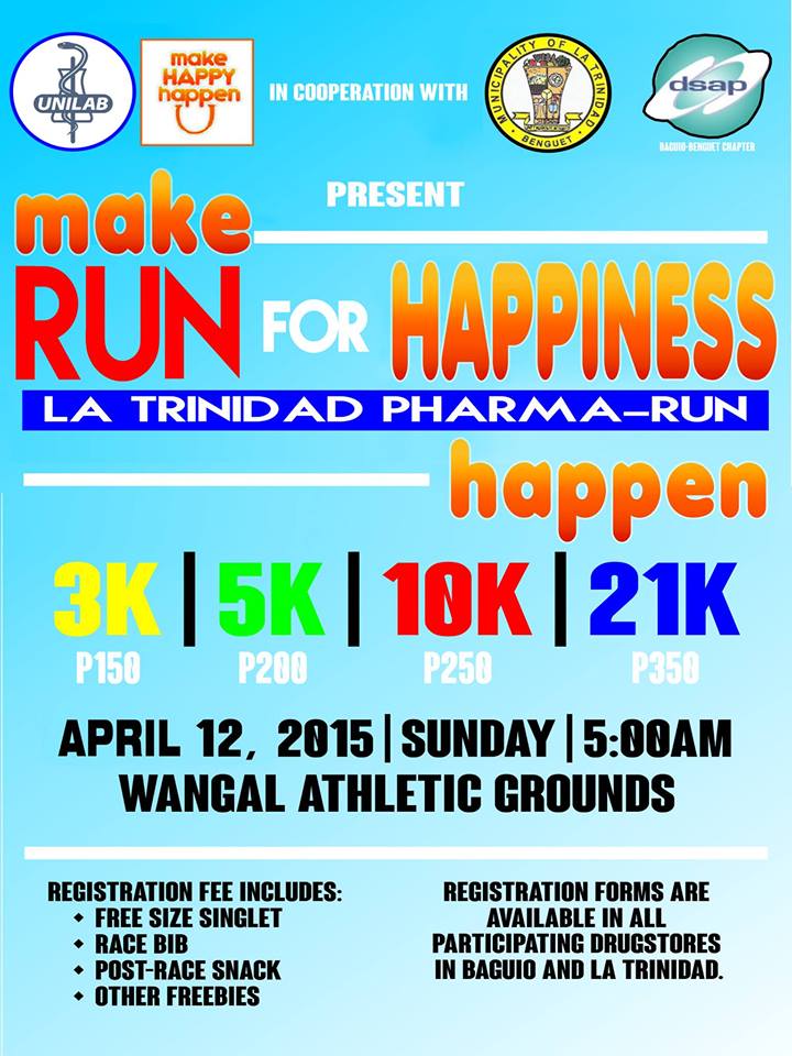 Make Run For Happiness Happen is happening on April 12, 2015 in La Trinidad, Benguet. This event is organized by the Drugstore Association of the Philippines – Benguet Chapter with the help and support of Unilab, Enervon and the Municipality of Benguet.
