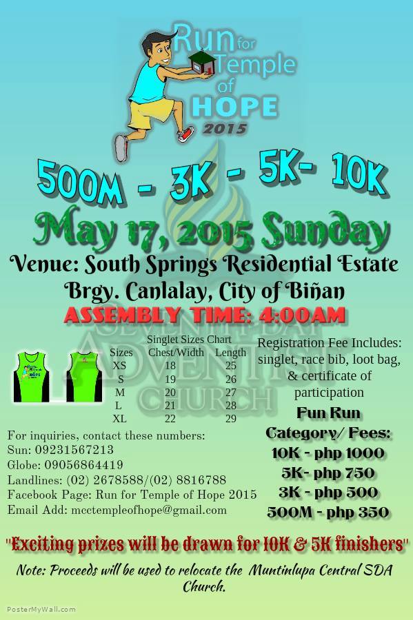 Run For Temple of Hope 2015 is happening on May 17, 2015 in Binan, Laguna. Proceeds from this event will be used to relocate the Muntinlupa SDA Church.