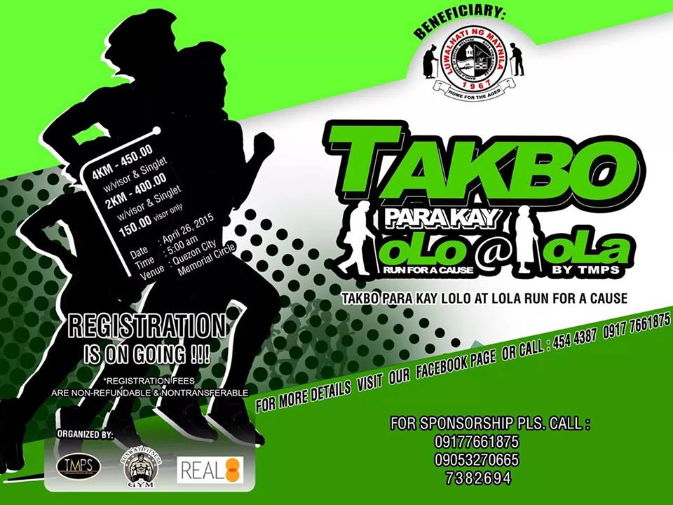 Takbo Para Kay Lolo At Lola is a fun run that aims to gather people who are willing to extend their help and support to the elderlies through a healthy activity. Proceeds from this event will benefit the elderlies of the Lualhati ng Maynila Foundation.