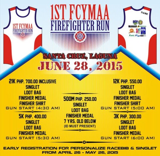 Filipino Chinese Young Men Athletic Association (FCYMAA) will be organizing its first FCYMAA Fire Fighter Run for the benefit of the volunteer fire fighters of Santa Cruz, Laguna.
