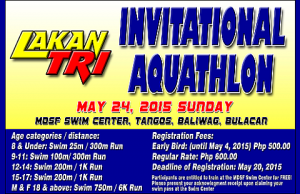 Registration is now open for the LakanTri Invitational Aquathlon! The event is set on May 24, 2015 at the MDSF Swim Center, Tangos, Baliwag, Bulacan.