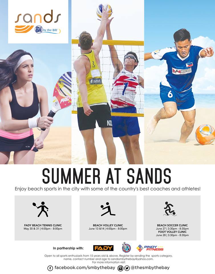 Got nothing to do for the rest of the summer season? Head on over to SM by the Bay! Feel the beach and have fun playing some awesome summer sports with some of the country’s best coaches and athletes! Summer At Sands offers tennis, soccer, beach volley, & foot volley clinics. Below are the schedules: