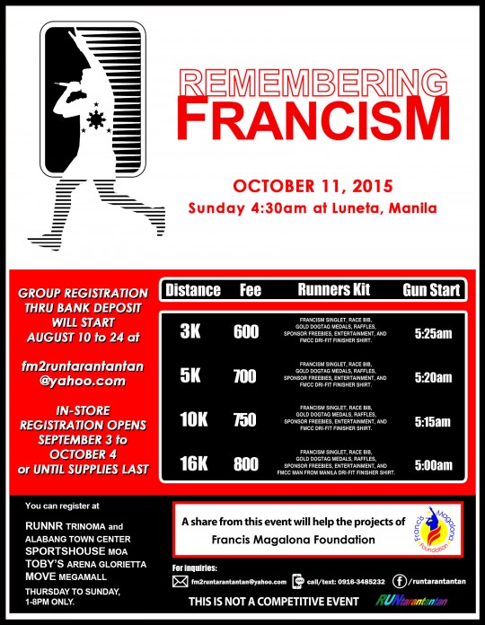 – Inclusive of Singlet, Race Bib, Gold Dogtag Medals, Raffle, Entertainment, FMCC Dri-Fit Finisher’s Shirt