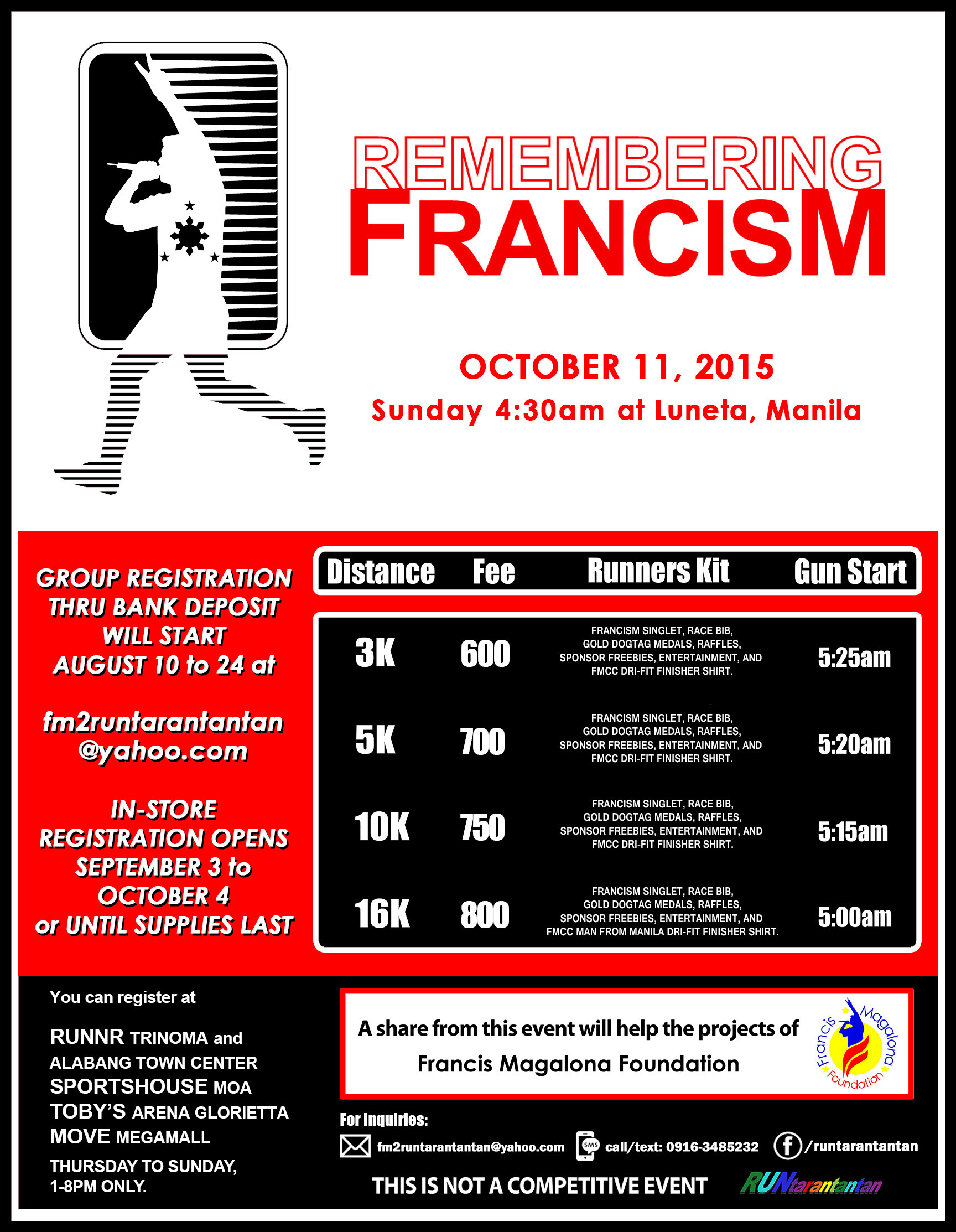 Run with th stars, BPositive, FrancisM. Lahat yan Online Registration kami. Pero ung kapatid ko nde sya naubusan ng size sa Finisher Shirt nia. Badtrip un. Nde Guaranteed!