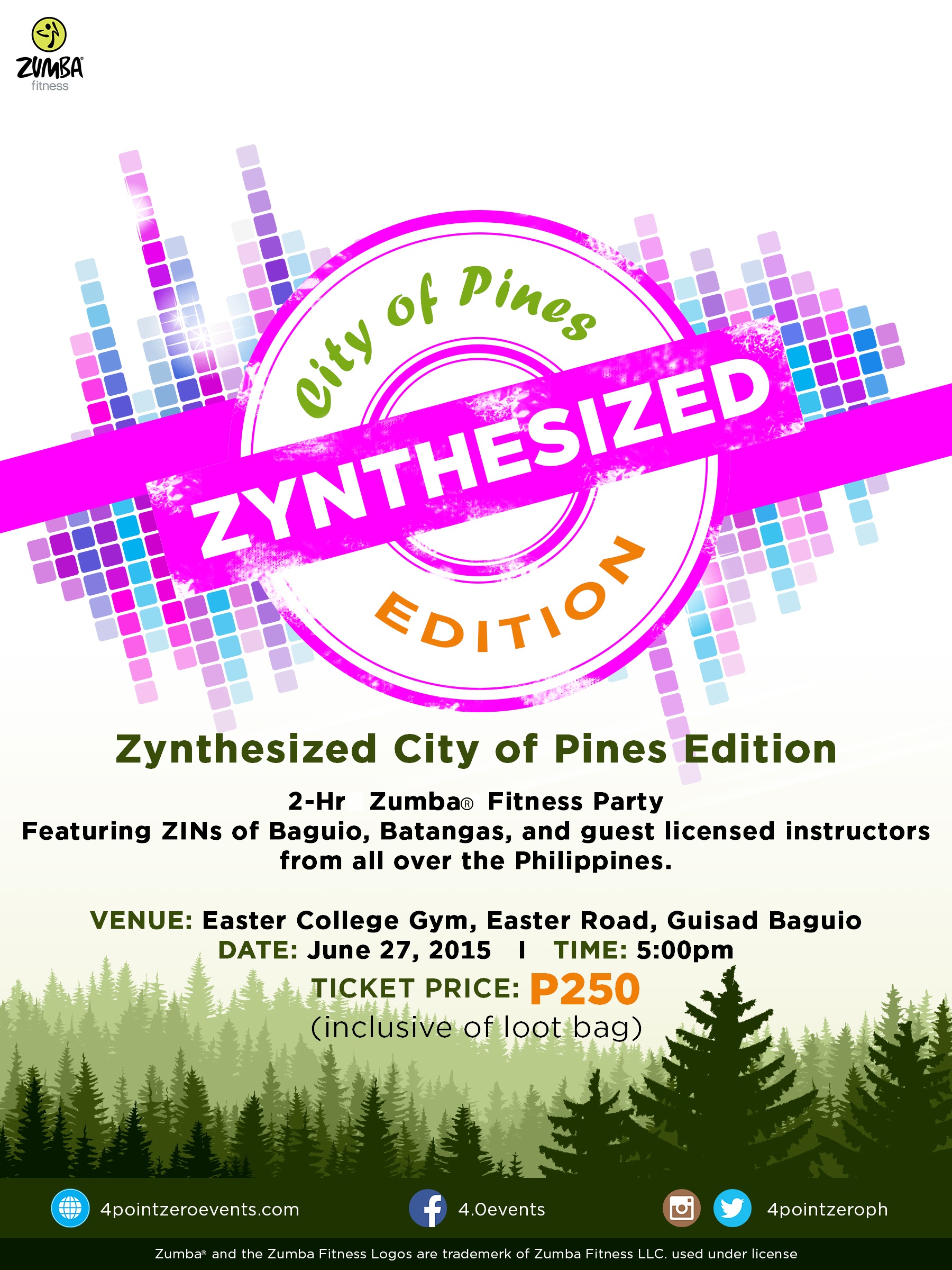 After the success of Zynthesized! – the biggest outdoor Zumba® Fitness party recorded in Batangas Province – the director and producer is bringing another leg up north. Zynthesized City of Pines Edition is 2-hr Zumba® Fitness Party to be held at Easter College Gym, Easter Road, Guisad Baguio City on June 27, 2015 at 5:00 – 7:00 PM.