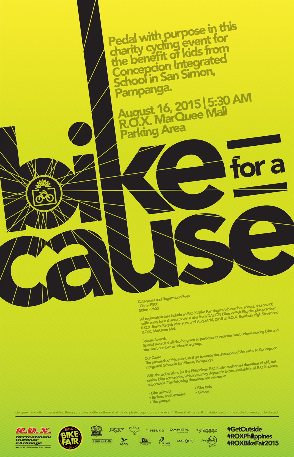 R.O.X. Bike For A Cause is happening August 16, 2015 at R.O.X. Marquee Mall. The proceeds of this event shall go towards the donation of bike racks to Concepcion Integrated School in San Simon Pampanga.