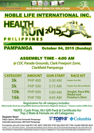After its successful race at the SM Mall of Asia last April 12, 2015, Health Run Philippines continues its goal to promote running and healthy lifestyle to different parts of the Philippines. This October 4, 2015, Noble Life Int’l Phil. Inc. is inviting everyone to join the Pampanga leg of Health Run Philippines 2015 at CDC Parade Grounds, Clark Freeport Zone,Clarkfield Pampanga.