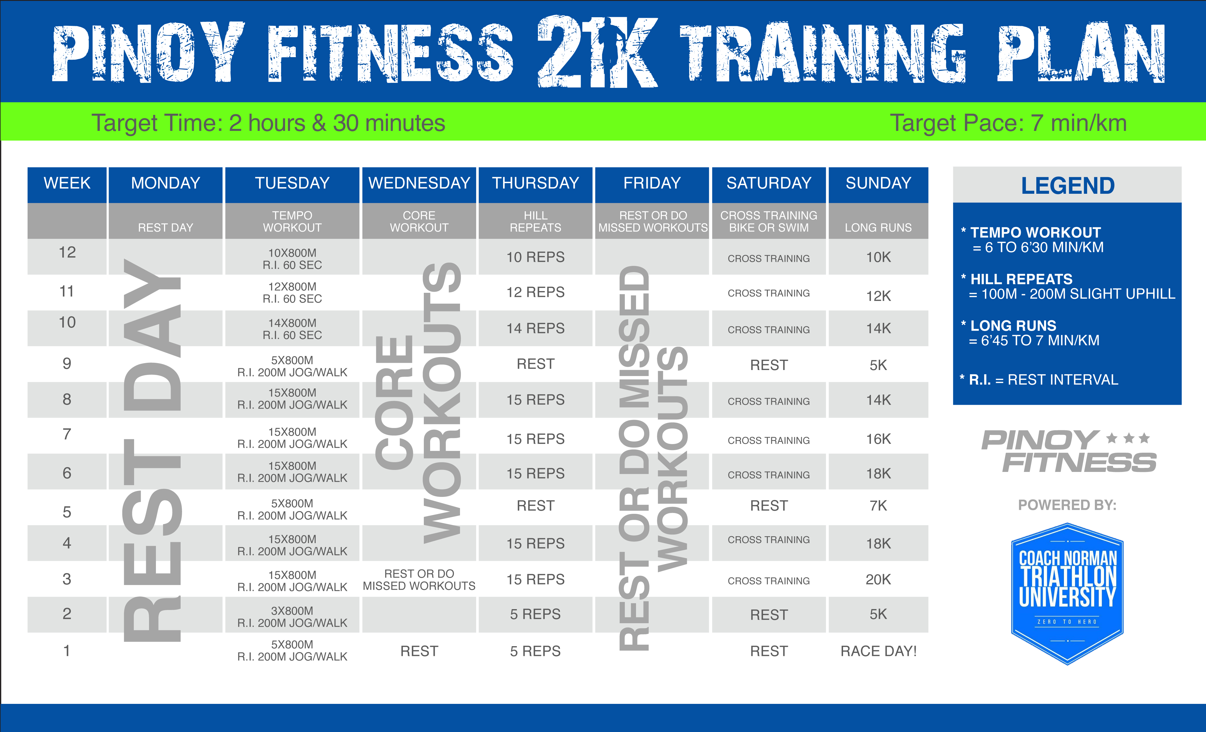We have partnered with Top local Triathlon Coach Norman Pascual to provide everyone a FREE 12 week race plan to help you hit the 2:30 21K Mark!