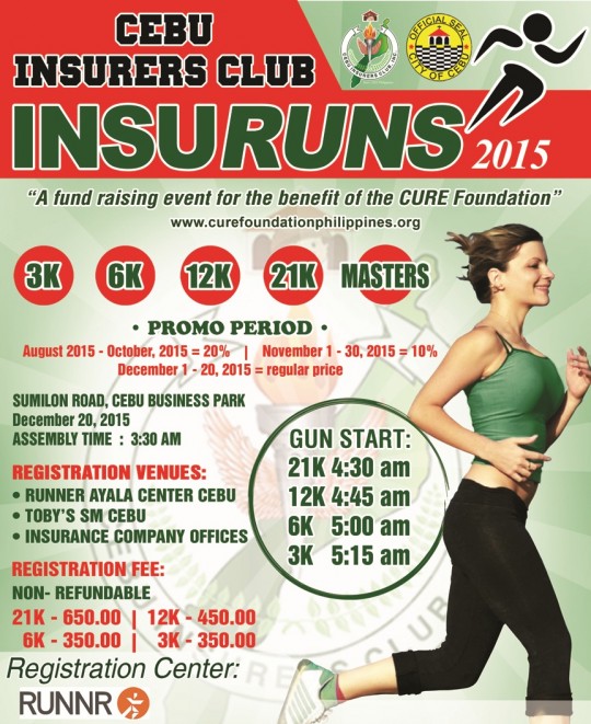 Cebu Insurers Club, Inc. brings you the CICI InsuRuns 2015 happening on December 20 in Cebu Business Park, Cebu City. This event is for the benefit of CURE foundation.