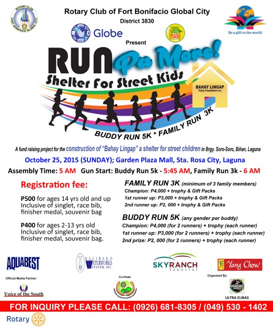 This is the first fun run activity of the Rotary Club of Fort Bonifacio Global City. This activity is targeted to raise fund for the construction of BAHAY LINGAP in Barangay Soro-Soro in Binan, Laguna. Bahay Lingap will serve as a shelter for the street children of Binan, and a haven for improving their lives.