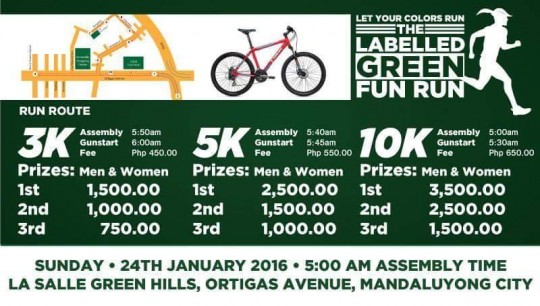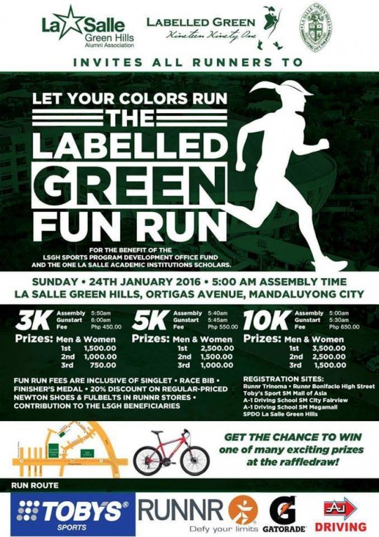 The Labelled Green Fun Run is happening on January 24, 2016 at La Salle Greenhills. This event is for the benefit of the LSGH Sports Program Development Office Fund and the One La Salle Academic Institutions Scholars.