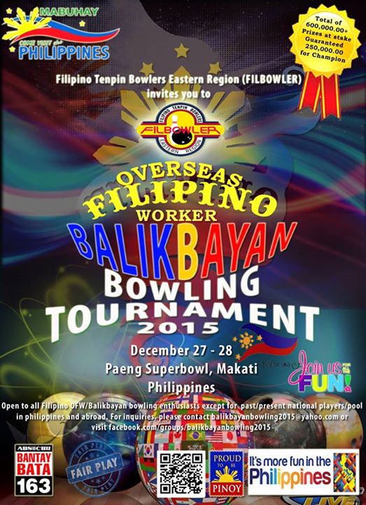 We are pleased to bring to all OFW’s and Balikbayan Filipino bowling enthusiasts around the world, the 2015 OFW Balikbayan Bowling Tournament from December 27 to 28, 2015 at Paeng Superbowl, 4th Floor, Makati Cinema Square, Makati, Metro Manila, Philippines.