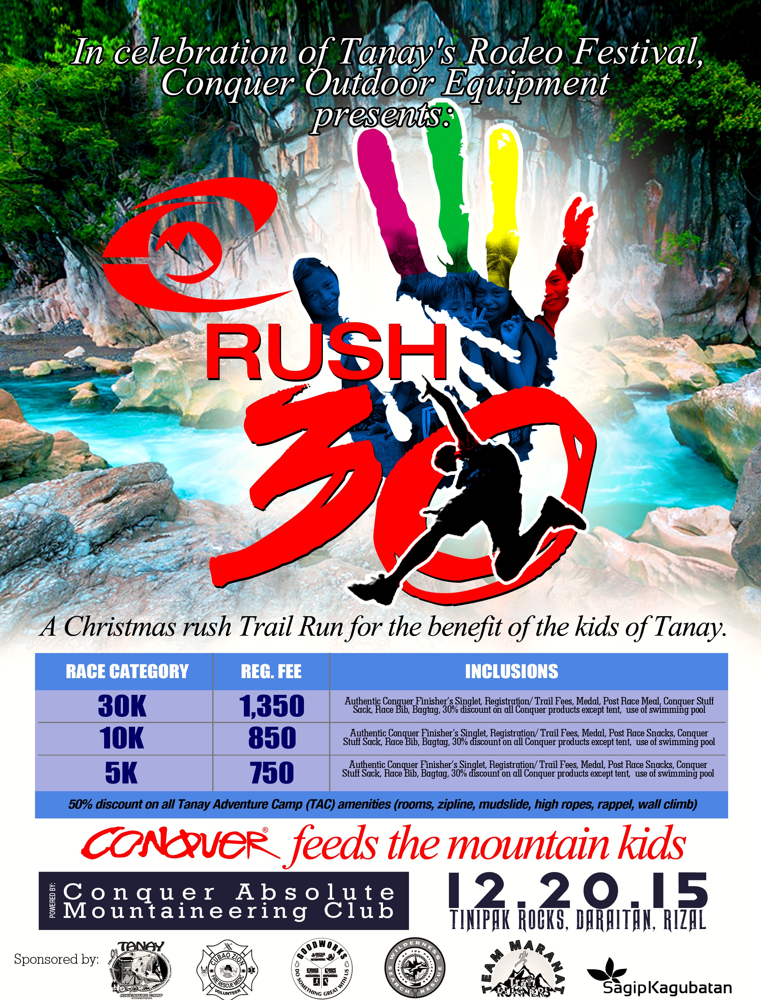 Conquer Rush Tinipak 30K (CRT30) is happening on December 20, 2015 at Tanay Adventure Camp, Tanay, Rizal.